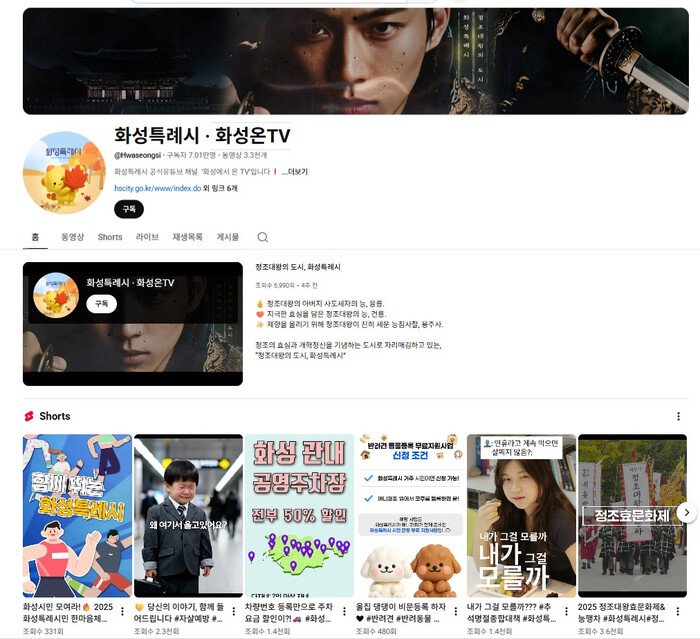 [화성=송윤근 기자] 경기 화성특례시 공식 유튜브 채널 ‘화성특례시·화성온TV’가 2025년 10월 기준, 전국 226개 기초지자체 중 구독자 수 2위를 기록하며 뜨거운 주목을 받고 있다.