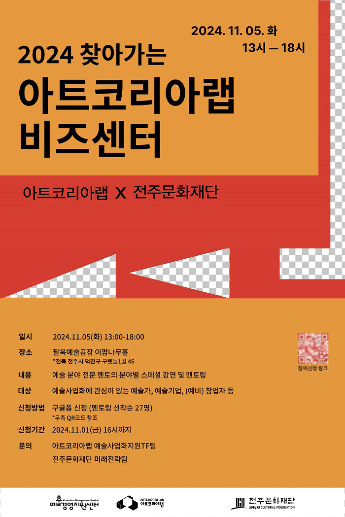 | ▲ 11월 5일, 전주시 팔복예술공장 이팝나무홀에서 열리는 ‘2024 찾아가는 아트코리아랩 비즈센터’행사 포스터 |