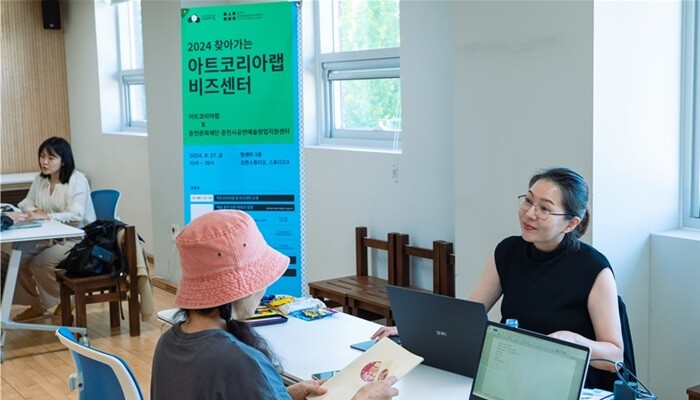 | ▲ 지난 9월 춘천시 공연예술창업지원센터에서 진행된 ‘2024 찾아가는 아트코리아랩 비즈센터’에서 한 참가자가 전문 멘토로부터 1:1 멘토링을 받고 있다. |