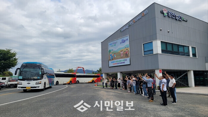 | ▲ 푸소 농가 운영주 등이 지난 19일 종합운동장에서 국제고등학교 학생들을 환송하고 있다. / 강진군 제공 |