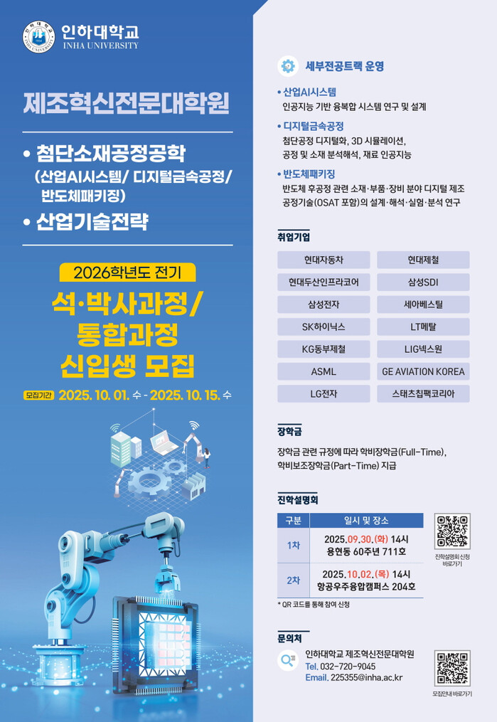 | 인하대 제조혁신전문대학원 2026학년도 전기 신입생 모집 포스터 (사진=인하대) |