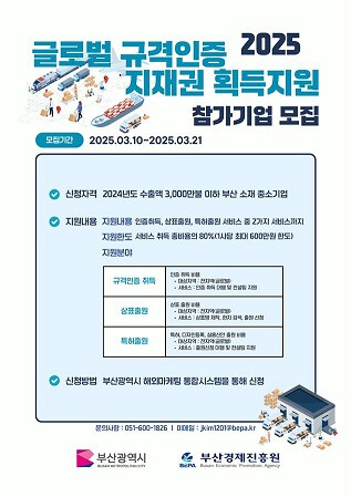 [부산=최성일 기자] 부산시(시장 박형준)와 부산경제진흥원(원장 송복철)은 지역 중소기업의 수출품에 대한 해외규격인증 취득과 지식재산권 확보를 위한 지원사업을 확대 추진한다고 밝혔다.