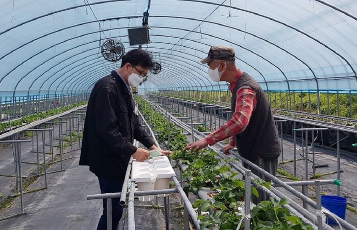 | ▲ 최영준 강진군 농업기술센터 원예연구팀장(사진 왼쪽)이 현지 기술지도를 하고 있다. / 강진군 제공 |