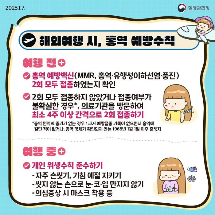 따라서 베트남, 필리핀, 말레이시아, 중국 등 홍역 유행국가를 방문할 경우 반드시 홍역 예방접종력을 확인하고, 접종력 확인이 어려운 경우 출국 최소 6주 전부터 2회 접종(최소 4주 간격)을 받을 것을 권고하고 있다.