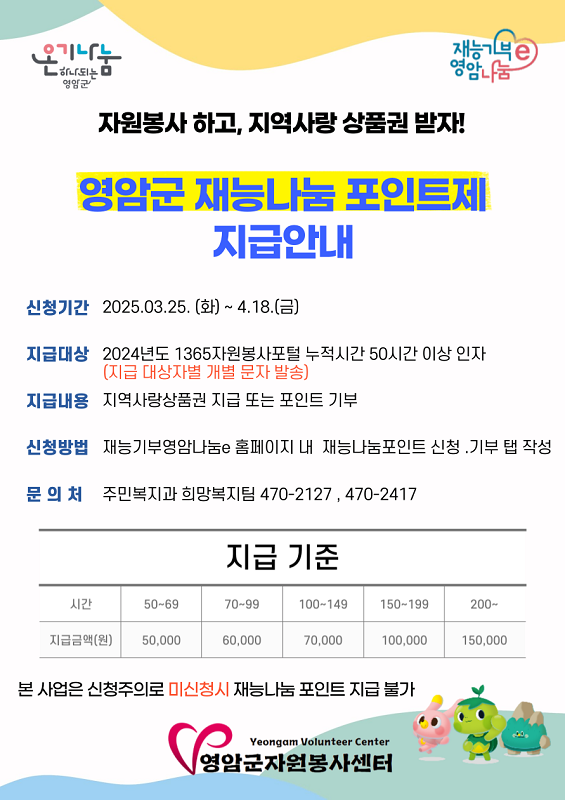 포인트 신청은 ‘재능기부 영암나눔e’ 홈페이지에서 할 수 있고, 인정 봉사 시간에 따라 영암군은 5~15만 원의 지역사랑상품권을 제공할 예정이다.