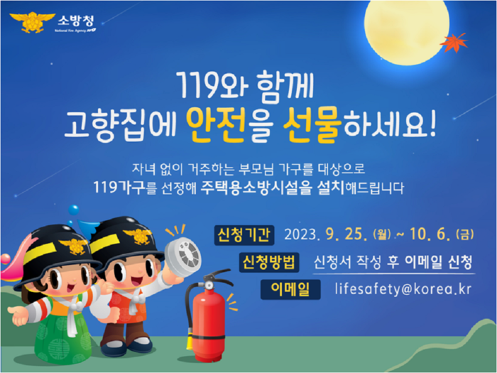 주택용 소방시설 선물하기 행사는 고향집에 자녀 없이 거주하는 부모님(아파트 제외)을 대상으로 본인 또는 자녀가 소방청 홈페이지에 접속해 신청 가능하다. 신청 대상에 선정되면 관할 소방서에서 방문설치를 진행한다.
