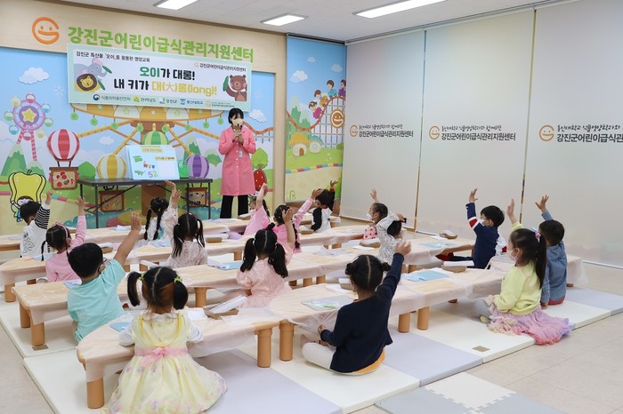 [강진=정찬남 기자] 전남 강진군 어린이급식관리지원센터(센터장 이인옥)는 지난 9일부터 11일까지 관내 어린이집 5개소 만 3~5세 어린이 58명을 대상으로 ‘오이가 대롱! 내 키가 대(大)롱!’ 주제로 영양 교육을 실시했다.
