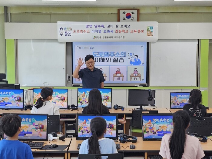| ▲ 강진군 토지관리팀 서재승 팀장이 강진동초등학교에서 도로명주소 교육을 하고 있다./ 강진군 제공 |