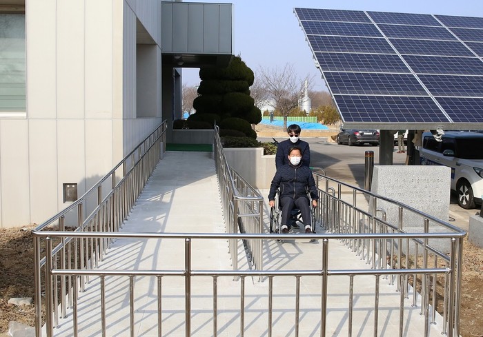 광주환경공단은 방문객들의 왕래가 잦은 본부동 입구에 경사로를 설치해 휠체어나 보행 보조기 등을 이용하는 시민들이 최대한 편리하고 빠르게 건물의 내·외를 이동할 수 있도록 했다.