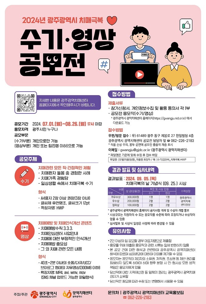 공모전 접수는 오는 8월 26일까지 이메일이나 우편, 방문을 통해 제출하면 된다. 자세한 사항은 광주시광역치매센터 누리집 공지사항을 참고하면 된다. 자세한 문의는 광주광역시 치매센터 교육홍보 팀으로 하면된다.