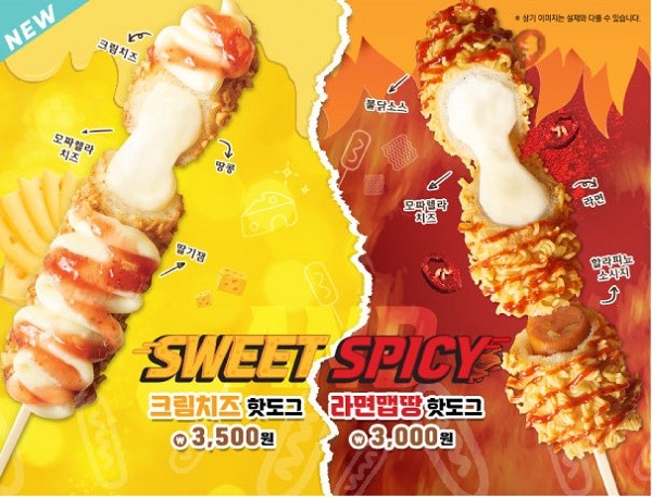 ‘라면맵땅 핫도그’는 매운 할라피뇨 소시지 반에 모짜렐라 치즈 반, 불닭소스까지 더해 매콤한 맛이 돋보이는 핫도그다. 핫도그에 라면땅을 더하면서 추억의 맛을 느낄 수 있다.