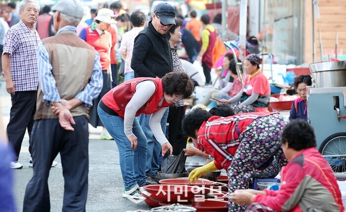 | ▲ 강진읍 시장을 찾은 주민이 수산물을 구입하고 있다. / 강진군 제공 |