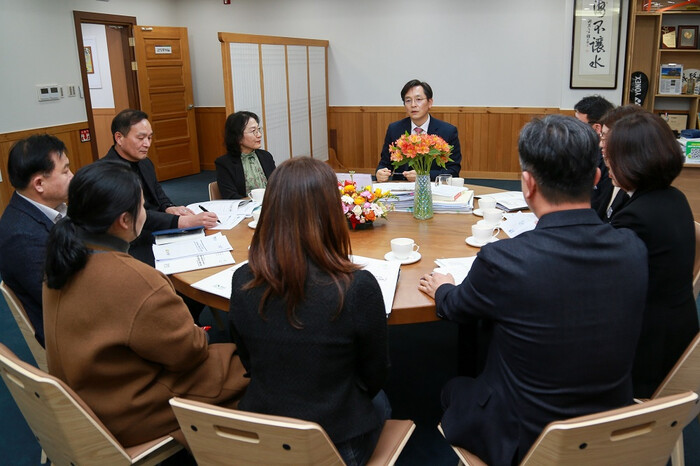 | ▲ 우승희 영암군수가 지난 12일 군청에서 전라남도농업기술원과 ‘농촌진흥사업 상생협력 간담회’를 주재하고 있다. / 영암군 제공 |