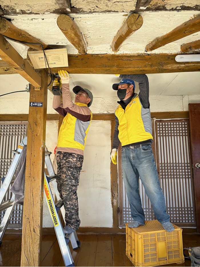 | ▲ 송지면 복지기동대 전기배선 작업 봉사활동 / 해남군 제공 |