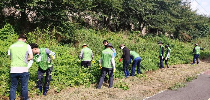 이날 교란식물 제거 활동에는 공단 직원 23명이 참여해 하천 생태계 위협 주종인 가시박, 환삼덩굴 등 생태계 교란식물 1톤 가량을 제거했다.