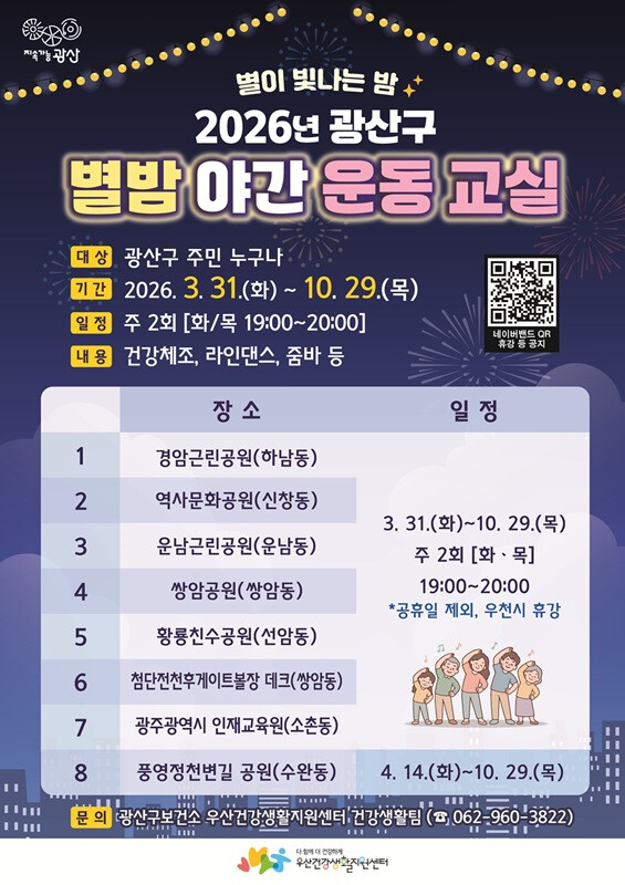 별밤야간운동교실은 남녀노소 누구나 무료로 참여할 수 있는 건강 체조로, 광산구 8개 공원에서 화요일과 목요일 주 2회 오후 7시부터 8시까지 진행한다.