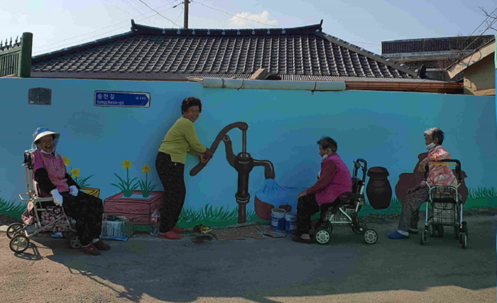 | ▲ 강진군 신전면 송천마을 주민들이 전남도의 "청정 전남 으뜸마을 만들기" 공모사업에 선정돼 마을 안길 벽화 정비 사업으로 달라진 환경을 즐기고 있다. / 사진=강진군 제공 |