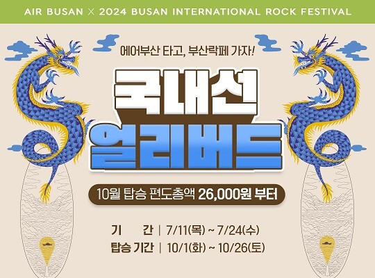 이번 프로모션은 11일 오전 11시부터 24일까지 약 2주간 진행되며, 국내선 전 노선(부산-김포, 부산-제주, 김포-제주)을 대상으로 편도 총액 운임(유류할증료 및 공항세 포함) 기준 26,000원부터 판매한다. 이번 프로모션 항공권의 탑승 기간은 10월 1일부터 10월 26일까지며, 에어부산 홈페이지 및 모바일 웹·앱을 통해 구매 가능하다.