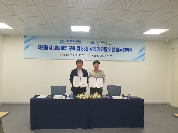 [목포=황승순 기자]국립공원공단다도해해상국립공원서부사무소(소장 이전웅)은 2일 국립목포대학교(총장 송하철)과 해양환경보전 및 자원봉사활성화를 위한 업무협약을 체결했다고 밝혔다.