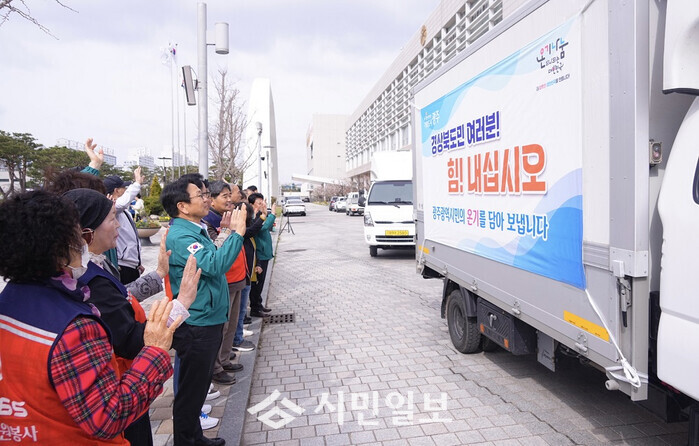 | ▲ 강기정 광주광역시장이 28일 오전 경남 산청군과 경북 청송군 등 대형 산불 특별재난지역으로 구호물품 전달하러 가는 물품지원 차량을 배웅하고 있다./광주광역시 제공 |