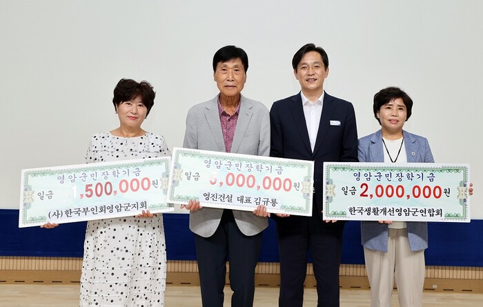 | ▲ 우승희 영암군수(오른 쪽부터 2번)가 지난 1일 영암군청에서 이경자 한국생활개선영암군연합회장, 이혜숙 (사)한국부인회영암군지회장, 김규룡 영진건설 대표로부터 (재)영암군민장학회 장학기금을 기탁 받고 기념촬영을 하고 있다. / 영암군 제공. |