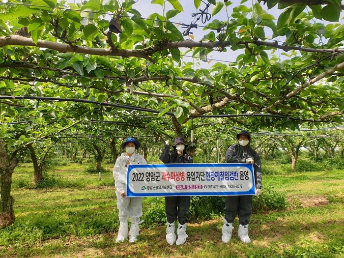 [영암=정찬남 기자] 전남 영암군은 최근 전국적으로 문제 되고 있는 과수화상병의 예방을 위해 ‘과수화상병 현장예찰점검반’을 운영해 병의 유입 방지에 총력을 기울이고 있다.