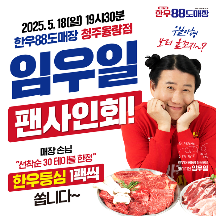 팬사인회는 5월 18일(일) 17시부터 충북 청주시 낙농농협 주성지점 뒤 건물에 위치한 한우88도매장 청주율량점에서 진행되며, 사인회 당일 매장 오픈 시간부터 매장 이용 고객에 한하여 선착순 30테이블 한정으로 100% 1등급 한우 등심을 1팩씩 증정하는 이벤트도 함께 진행된다.