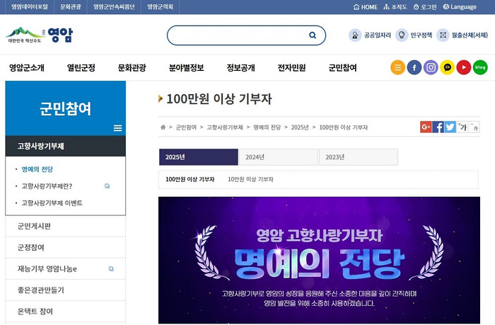 영암군홈페이지에서 ‘군민참여>고향사랑기부제>명예의 전당’의 경로로 들어가면 제도가 생긴 2023년부터 연도별로 나눠 기부자 이름을 볼 수 있다.