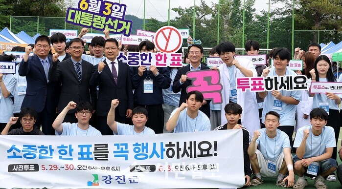 [강진=정찬남 기자] 제21대 대통령선거를 앞두고 전남 강진군 관계자들이 지난 21일 열린 전남영농학생축제에 참석한 청소년들과 함께 투표 참여 독려 홍보 캠페인을 벌이며 군민의 투표 참여를 독려했다.