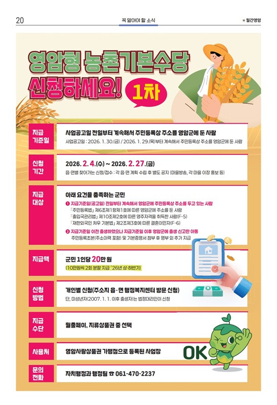 이번 1차 농촌기본수당은 주민등록상 지난 1월 29일부터 영암군민인 사람에게 1인 당 10만 원을 지급하고, 결혼이민자(F-6), 영주자격 취득자(F-5)도 포함된다.