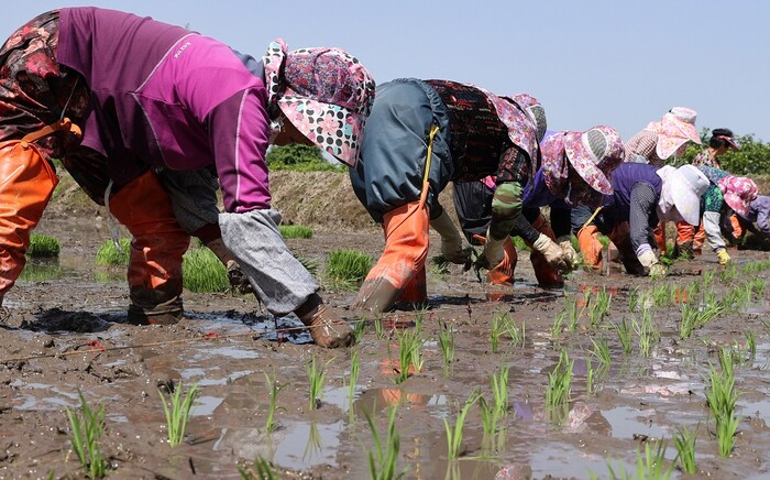 *사진설명 : 병영면 박동리에서 강진군 국가중요농업유산 보전협의체 회원들이 못줄에 맞춰 손 모내기를 하고 있다.
