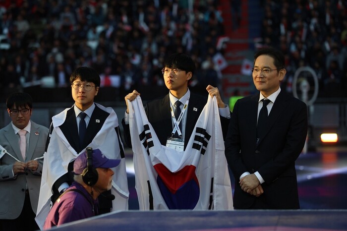 | ▲ 이재용 삼성전자 회장(오를 쪽 첫번째)이 파리 기능올림픽대회에서 광주소프트웨어마이스터고등학교 출신인 김겸온‧김용현 선수, 모바일로보틱스 직종에서 금메달, 정현문 선수 클라우드컴퓨팅 직종에서 은메달을 차지한 참가자들과 기념촬영을 하고 있다. / 광주광역시 제공 |