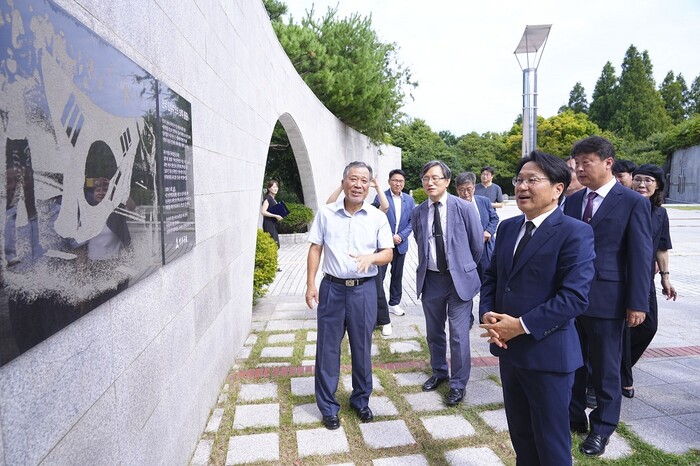 | ▲ 강기정 광주광역시장이 지난 8월16일 오후 부산광역시 중구 부산민주공원을 방문해 넋기림마당을 참배한 뒤 추모시설을 둘러보고 있다./광주광역시 제공 |