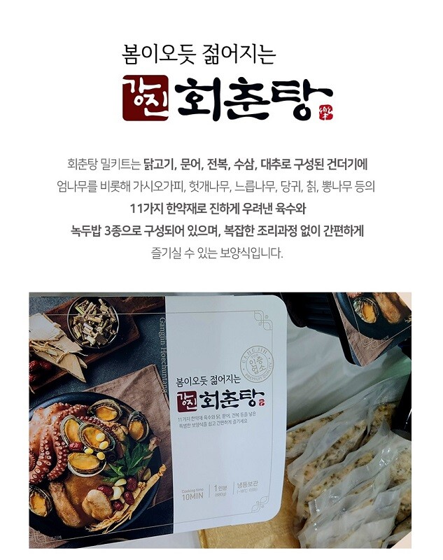 건강과 맛을 동시에 만족시키는 강진 회춘탕 밀키트는 1인용으로 1만5,000원에 구매할 수 있으며, 진하게 우려낸 육수와 건더기(닭고기, 문어, 전복, 수삼, 대추), 녹두죽으로 구성돼 있다.