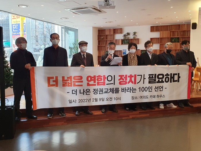 민변 창립 멤버인 박인제 변호사, 노무현 정부의 김진현 전 과기처 장관 등 원로급 인사들이 참여한 ‘더 나은 정권교체를 바라는 100인 선언’은 이날 “정권 교체를 바라는 국민의 목소리가 높지만 제1야당의 수권 능력에 대한 우려 또한 깊다”며 “대통령 선거의 불확실성을 제거하기 위해 야권의 모든 정당과 후보들이 대연합해줄 것을 요청한다”고 말했다.