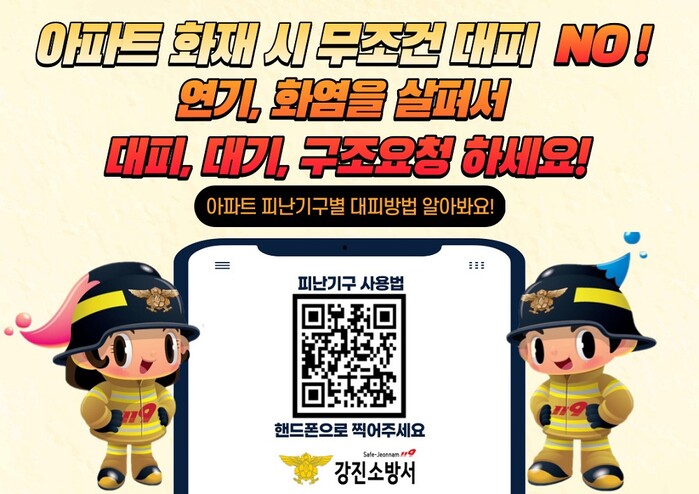 강진소방서 관계자는 “최근 연이은 아파트 화재로 안타까운 인명피해가 발생하고 있다”며“개선된 아파트 화재 피난 안전대책이 일상속에 녹아 습관적인 행동요령으로 자리잡도록 교육과 홍보를 지속해 인명피해 최소화에 최선을 다하겠다”고 말했다.
