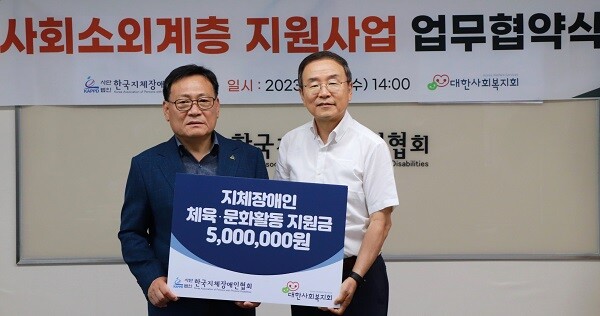 대한사회복지회(회장 강대성)는 한국지체장애인협회(중앙회장 김광환)에 장애인의 체육, 문화활동 지원금 500만원을 전달했다고 18일 밝혔다.