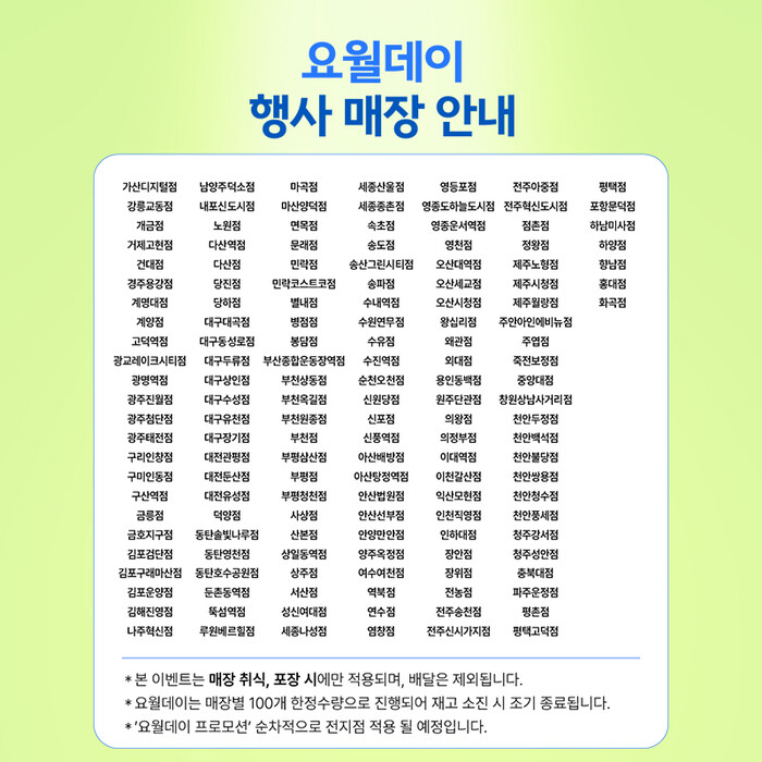 한편, 이번 요월데이 프로모션은 전국 요거트월드 가맹점 중 총 151개 지점에서 진행될 예정이며, 진행 매장은 요거트월드 공식 홈페이지 및 SNS를 통해 확인할 수 있다.