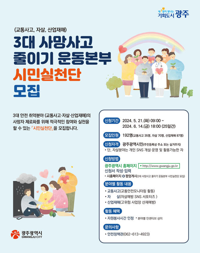 대상은 주민등록상 주소 또는 실거주지가 광주광역시인 광주시민이며, ‘교통 35명’, ‘자살 70명’, ‘산업재해 87명 등 총 192명을 모집’한다. 단 자살분야는 개인 사회관계망서비스(SNS) 활용이 가능해야 한다.