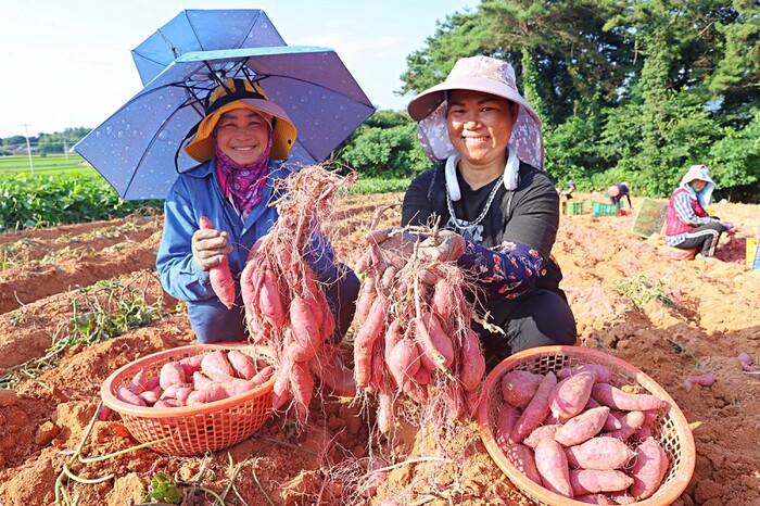 올해는 긴 장마로 수확이 다소 늦어진 편으로, 8월 초부터 밤고구마인 진율미 품종이 주로 출하되고 있다.