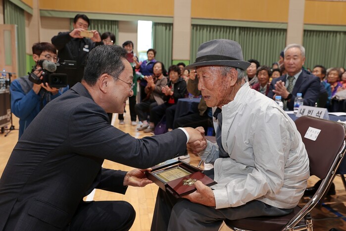 | ▲ 명현관 군수(왼쪽)가 문내면 다목적회관에서 열린 노인의 날 행사에서 모범노인의 상에 선정된 수상자에게 상패를 전달하고 있다. |
