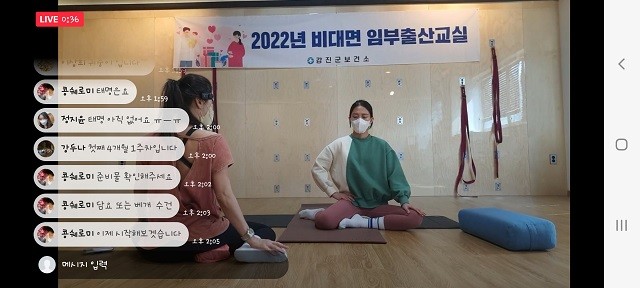 밴드(BAND) 라이브 방송을 통해 산모를 위한 스트레칭, 호흡법 등 각 임신 개월 수에 필요한 임신부 요가를 실시하고 방송 참여자에게 태교를 위한 출산(아기)용품 만들기 키트와 모자보건사업 건강관리 책자 및 홍보 물품을 제공했다.