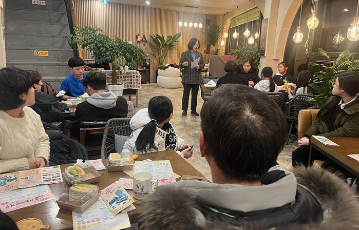 | ▲ 강진군 군민행복과 담장직원이 지난 25일 레오808카페에서 강진군 아동참여위원회 회의에서 아이들의 놀권리 보장을 위한 어린이 놀이시설 설치 등에 대한 의견을 나누고 있다. / 강진군 제공 |