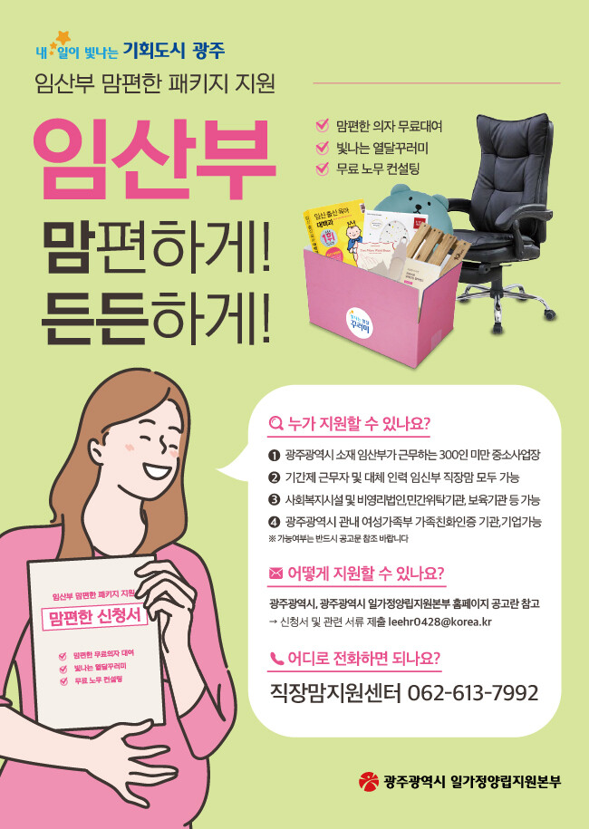 신청은 17일 오후 1시부터 이메일로 선착순 접수받는다. 자세한 내용은 광주시 일가정양립지원본부 누리집에서 확인할 수 있으며, 문의는 일가정양립지원본부 직장맘지원팀으로 하면 된다.