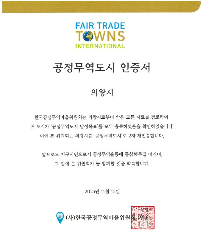 [의왕=송윤근 기자] 경기 의왕시(시장 김성제)가 (사)한국공정무역마을위원회로부터 공정무역도시 2차 재인증을 획득했다.