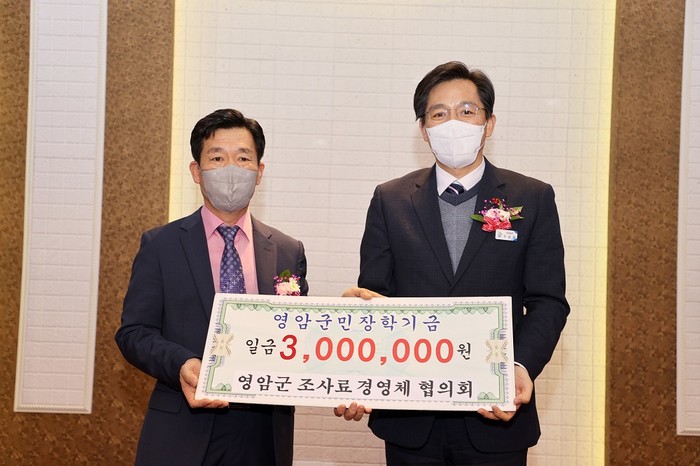 | ▲ 전용선 영암군 조사료 경영체 협의회장이 300만 원의 군민장학금을 영암군에 기탁하고 우승희 영암군수와 기념촬영을 하고 있다. / 영암군 제공 |