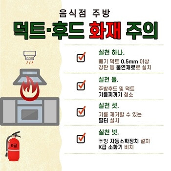 음식점 주방은 화기를 사용하는 시간이 많아 화재 위험이 높은 장소로 꼽히며, 특히 덕트와 후드의 기름 찌꺼기로 인해 화재가 발생할 가능성이 크다.