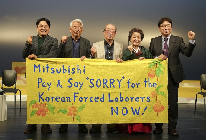 [광주=정찬남 기자] 강기장 광주광역시장(왼쪽 첫번째)이 24일 오후 남구 빛고을시민문화관 대극장에서 막을 올린 일제 강제동원 조선여자근로정신대 피해자들의 이야기를 담은 연극 ‘봉선화Ⅲ’ 공연을 관람한 뒤 일본 나고야미쓰시비조선여자근로정신대소송 지원회 다카하시 마코토 공동대표, 나카 토시오 감독 등 출연진들과 기자회견을 한 뒤 기념촬영을 하고 있다./광주광역시 제공