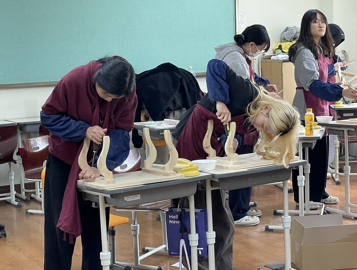 | ▲ 영암군청소년센터가 실시한 목재 테이블 만들기 프로그램에 참여한 고3 학생들 / 영암군 제공 |