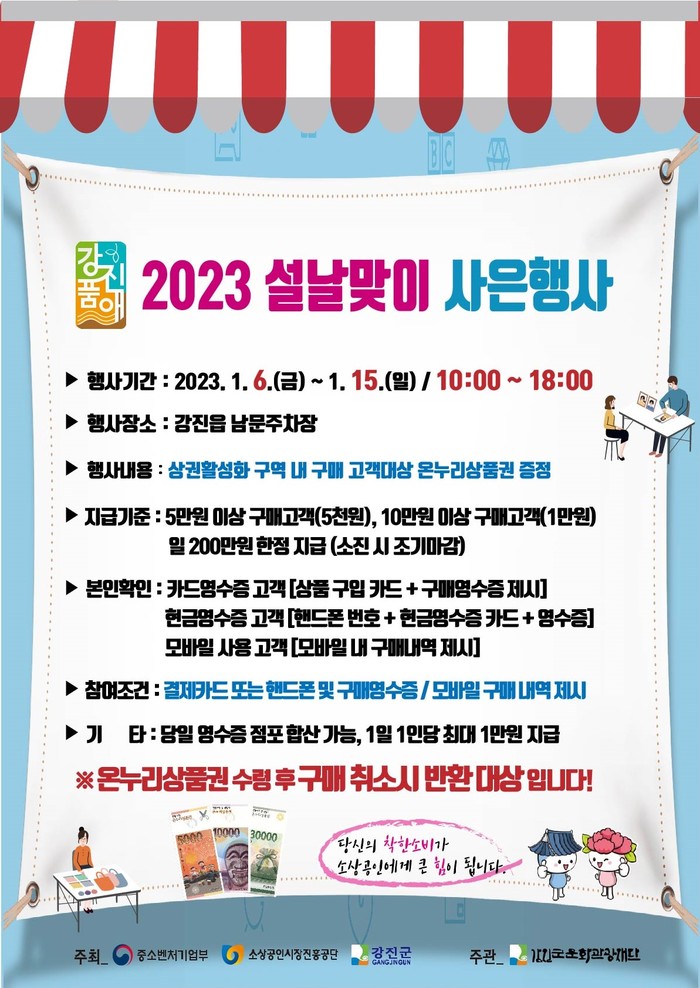 강진읍 남문주차장 상권활성화 구역 내에서 실시하는 이번 행사는 소상공인 소득증대와 지역경제 활성화를 위해 2023년 1월 6일부터 15일까지 총 10일간 5만 원 이상 구매고객에게 온누리상품권 5천 원 권, 10만 원 이상 구매고객은 온누리상품권 1만원 권을 증정한다.
